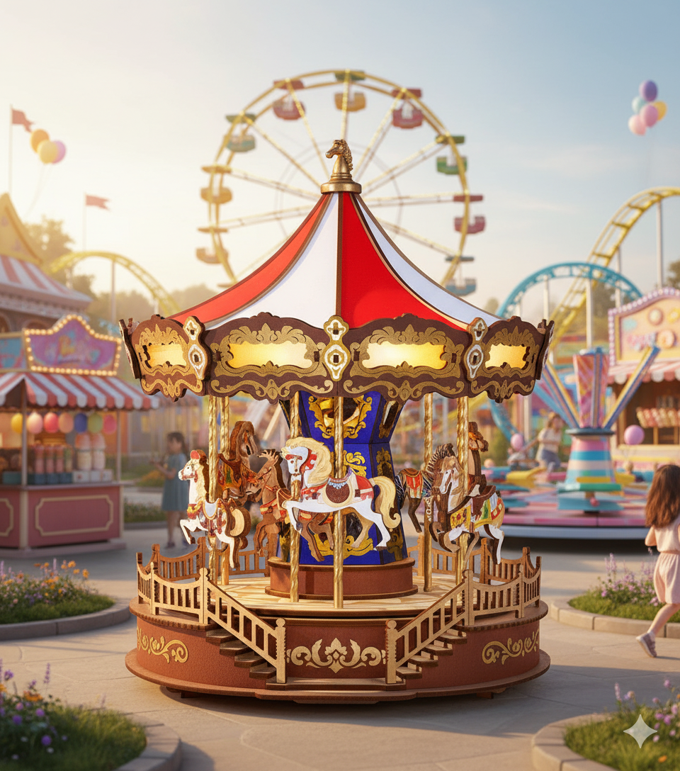 🧩 265 precyzyjnie wyciętych elementów tworzy realistyczną miniaturę klasycznej karuzeli, uzupełnioną o drobne detale, takie jak lustra, zdobione konie i uchwyty do podnoszenia. Dzięki ciepłemu oświetleniu LED i muzycznemu mechanizmowi model po złożeniu staje się żywym dziełem sztuki.